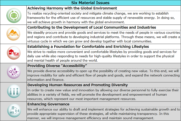 Sumitomo Corporation Group positions “Six Material Issues to Achieve Sustainable Growth with Society” as an important factor in developing business strategies and in the decision-making process for individual businesses. Going forward, we will pursue sustainable growth by resolving these issues through our business activities. This project especially contributes to “Achieving Harmony with the Global Environment”, “Contributes to the Development of Local Communities and Industries” and “Establishing a Foundation for Comfortable and Enriching Lifestyles”.
