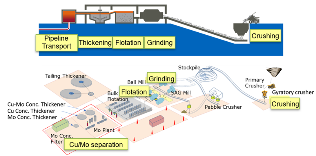 ・ Metallurgical operation: Copper and molybdenum concentrates are produced by floatation method.