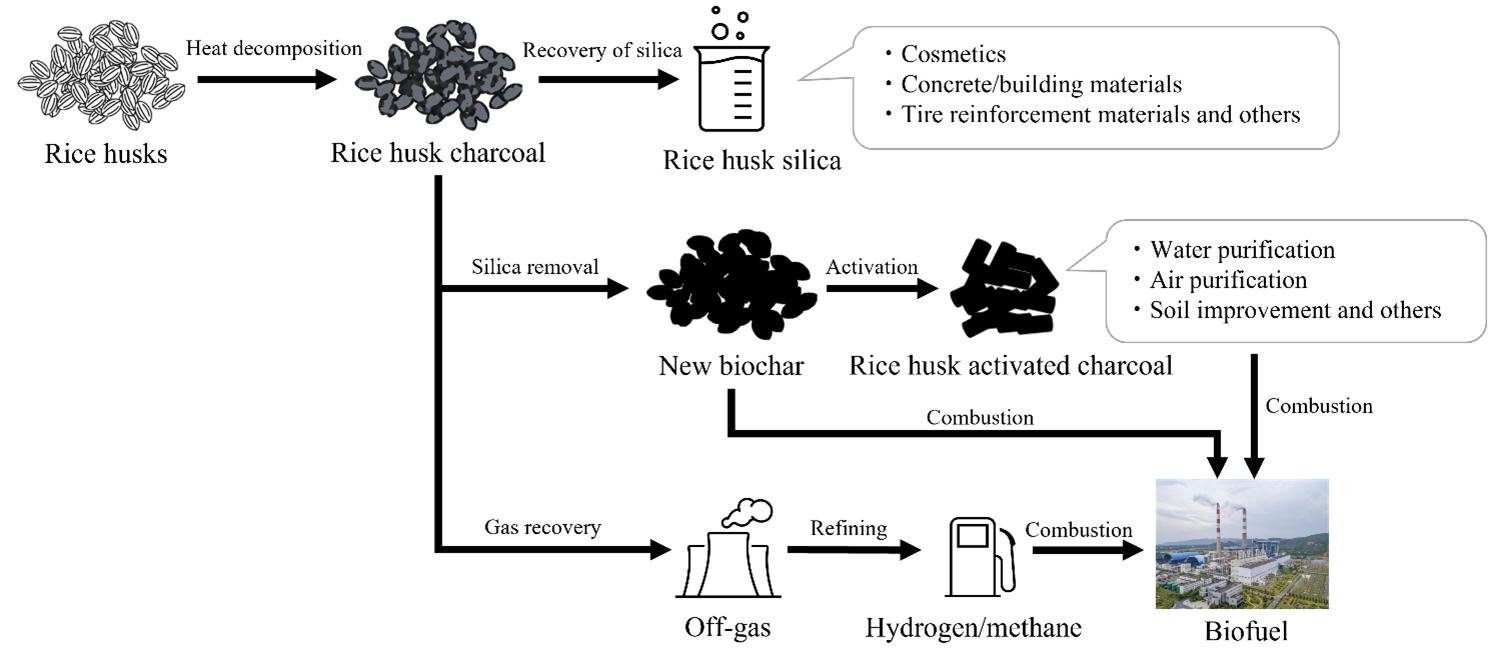 Large volumes of rice husks are generated as waste products around the world. By using them to produce bioenergy with substantially lower CO2 emissions as well as silica and activated charcoal, biochemicals that can be sold at high unit prices, Sumitomo Corporation aims to contribute to decarbonization in a way that is economically rational. Under this initiative, with support from Tainai City in Niigata Prefecture and the local Japan Agricultural Co-operative (JA), technologies and applications will be developed for the establishment of a new business model for decarbonization based on local production for local consumption, with a view to expanding it across Japan and the wider world.