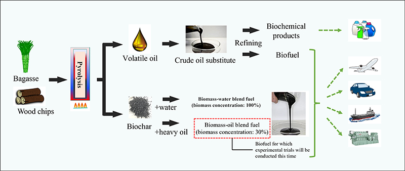 Solariant is a renewable energy development and investment company headquartered in the US state of California. Its Japanese arm also engages in biofuel trading. The biofuel newly developed by Solariant differs from conventional biofuel products derived from waste food oil in that it is a “biomass-heavy oil blend” that contains biochar produced from the pyrolysis of bagasse and wood chips at the rate of 30%. Going forward, the concentration of biomass (biochar) will be further increased to reach 100% to develop a “biomass-water blend” fuel.