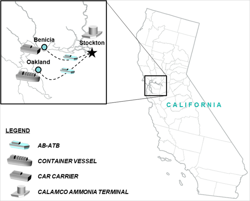 CALAMCO is a California based cooperative composed of grower members, as well as the largest ammonia distributer in California.. The Study aims to explore possibility to utilize CALAMCO’s existing ammonia storage terminal at port of Stockton for a pilot demonstration project of ammonia bunkering for car carriers calling at port of Benicia and container vessels calling at port of Oakland as first step toward wide adoption of ammonia as marine fuel in the US West Coast. Port of Benicia is one of the key vehicle-handing ports in U.S. West Coast, while Port of Oakland also rank among top 10 of US largest container ports.