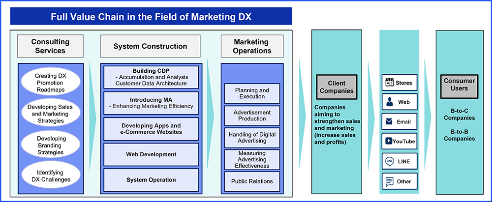 Sumitomo Corporation Group has a full value chain strategy in the field of marketing DX. Through its wholly owned consolidated subsidiary, SC Digital, the Group has established a system to provide client companies with a full range of services, from consulting to system implementation and marketing operations, to provide business offerings that meet our clients' challenges and needs.