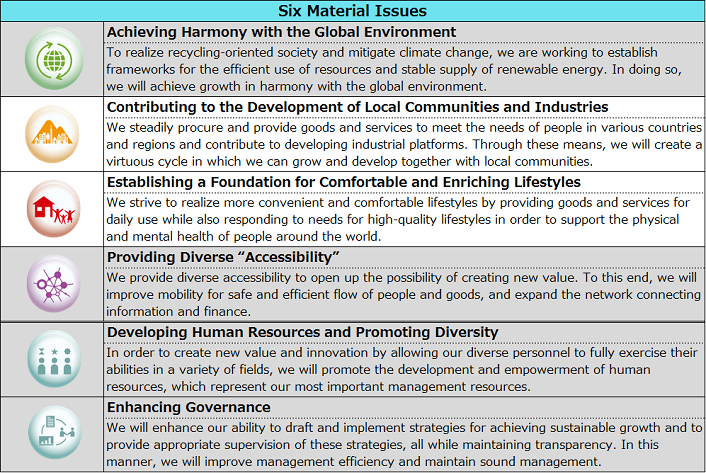 The Sumitomo Corporation Group has defined the “Six Material Issues to Achieve Sustainable Growth with Society” as an important factor in developing business strategies and in the decision-making process for individual businesses. Going forward, we will pursue sustainable growth by resolving these issues through our business activities. This project should prove especially beneficial in “Contributing to the Development of Local Communities and Industries” and “Establishing a Foundation for Comfortable and Enriching Lifestyles.”
