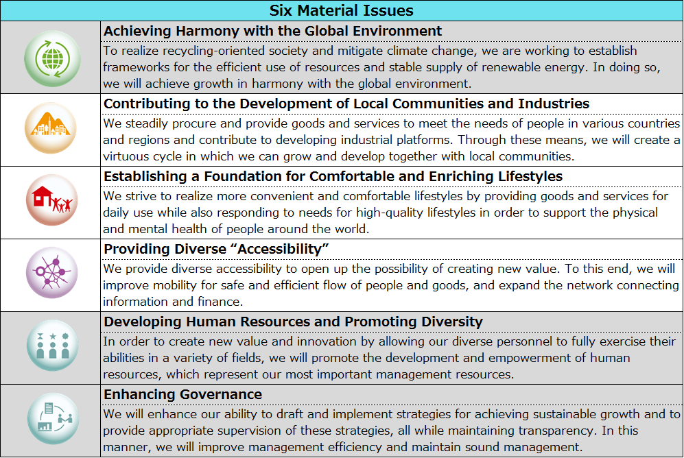 Sumitomo Corporation Group positions “Six Material Issues to Achieve Sustainable Growth with Society” as an important factor in developing business strategies and in the decision-making process for individual businesses. Going forward, we will pursue sustainable growth by resolving these issues through our business activities. This Project especially contributes to “Contributing to the Development of Local Communities and Industries” and “Establishing a Foundation for Comfortable and Enriching Lifestyles” and “Providing Diverse “Accessibility”.