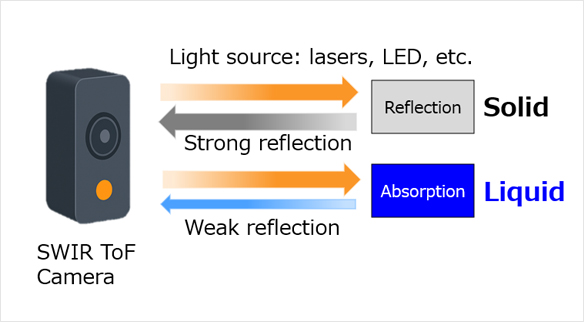 - SWIR technology distinguishes between materials based on their absorption and reflection characteristics, even when such differences are invisible in ordinary light. Because water appears black under SWIR and the imaging is unaffected by fog, smoke or dust, stable sensing is possible even in harsh environments. This enables detection of liquids, foreign substances and material differences that conventional cameras struggle to capture.