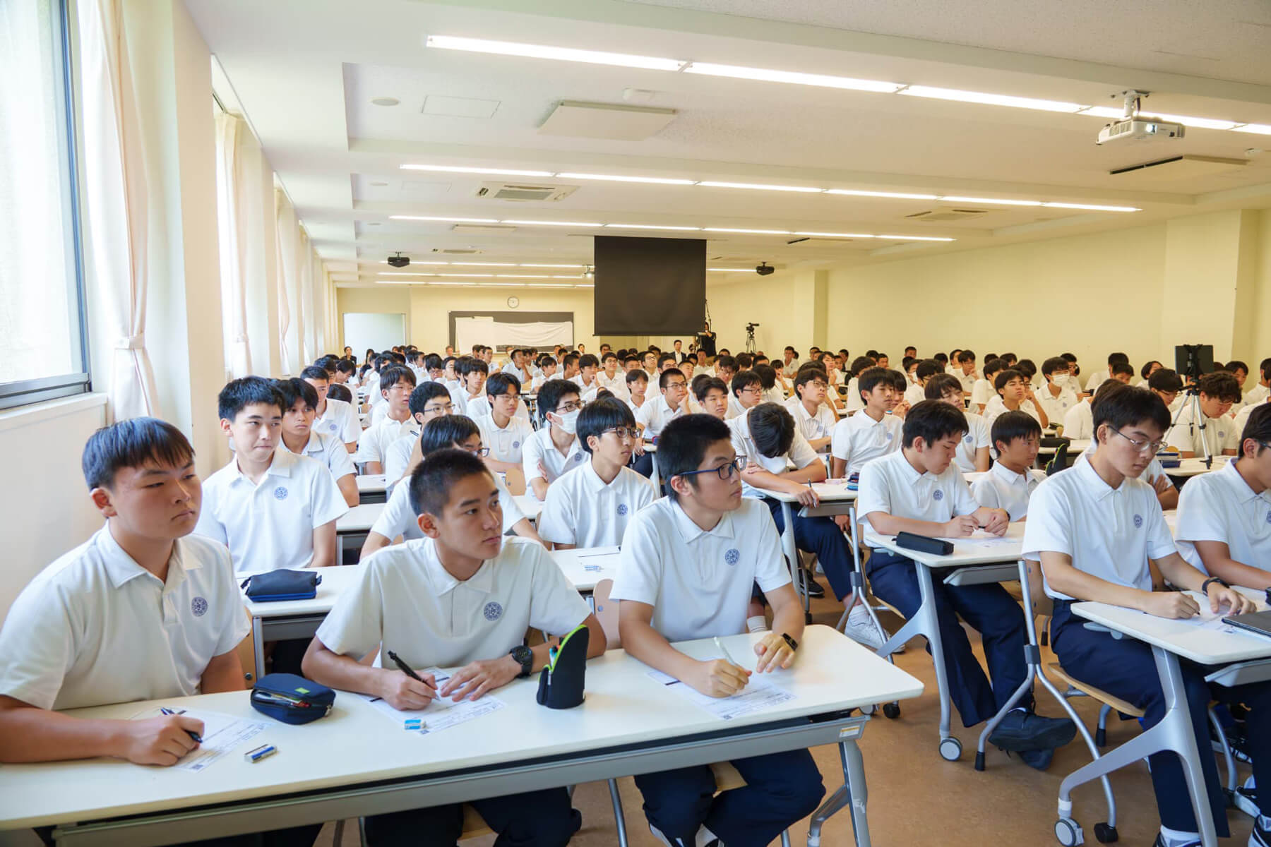 The Mirai School at Rokko Junior/Senior High School in Hyogo Prefecture, Japan – Ueno's alma mater – comprised two parts: a talk by Ueno and a roundtable session for students who wished to take part. For the talk, all third-year high school students gathered in the large hall, and other grades joined online. In total, around a thousand students participated.