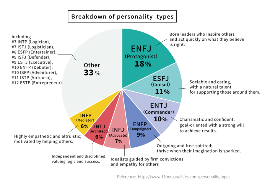 Yamashita The most common personality type among respondents was "ENFJ (Protagonist)," followed by "ESFJ (Consul)" and "ENTJ (Commander)."