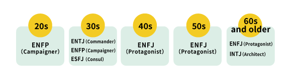 Oka Looking at the results by age group, the top type, ENFJ, appears more frequently among employees in their 40s and older, and is less common among those in their 20s and 30s. That might mean there's a higher chance that your boss is ENFJ!