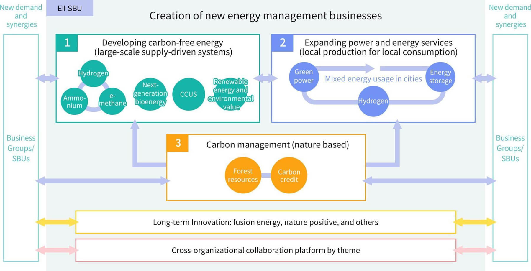 For each theme, we form cross-organizational collaboration platforms that bring together internal and external organizations. Through repeated hypothesis testing and validation, these platforms have given rise to sales organizations pursuing concrete businesses such as carbon credits, CCUS and bioenergy.
