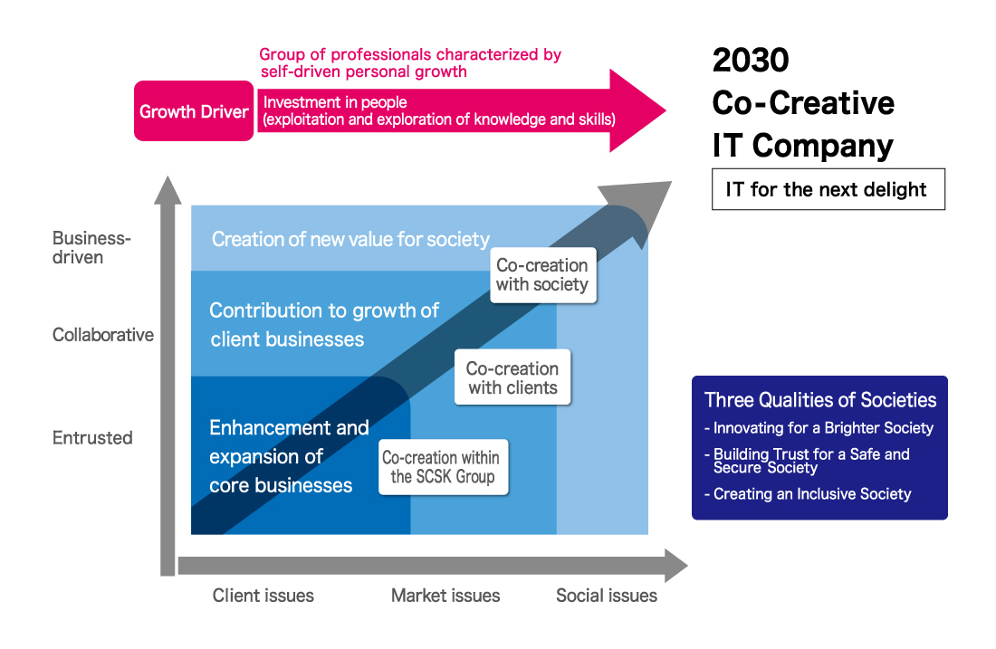 With the Corporate Philosophy and the “Material Issues” as the SCSK Group’s raison d'être, SCSK has set the “Grand Design 2030” as the vision for 2030. Through their core business of IT services, SCSK will become the “Co-Creative IT Company” that grows together with customers and society, by expanding provision of value, by demonstrating the comprehensive strengths of the SCSK’s groups, and by proactively working to create value for society.