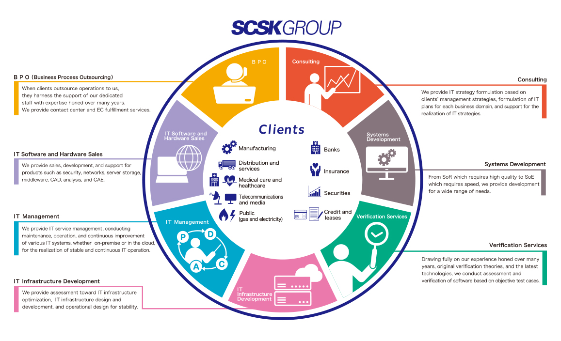 For the past 50 years, SCSK has provided a full lineup of IT services that are essential for customers’ business – from consulting to system development, software verification services, IT infrastructure development, IT management, IT hardware/software sales, and business process outsourcing services (BPO) – and resolved a variety of issues for more than 8,000 customers. SCSK have also supported the overseas expansion of its customers by leveraging both its track record of system implementation in more than 38 countries worldwide and also experience of providing IT services to Sumitomo Corporation and other global companies. To assist further improvement of customers’ corporate value, SCSK challenges the realization of digital transformation (DX) through various co-creation.
