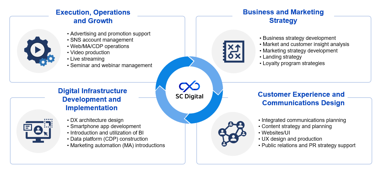 Today, SC Digital supports companies end-to-end across the domains of marketing and digital transformation (DX), spanning data utilization, customer-experience design, brand strategy, and system implementation and operations. As a growth partner to corporations across a wide range of industries, it has built an extensive track record. Its particular strength lies in providing integrated support across four core areas.