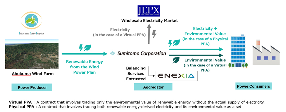 Initially, the wind farm was planned to operate under the FIT (*4) system; however, upon commencing operations, it transitioned to the FIP system, enabling direct transactions with power consumers. The renewable energy and environmental credits generated by the wind farm will be purchased in full by the Sumitomo Corporation Group, which will act as an aggregator (*5) and enter into corporate PPAs with electricity consumers. By trading the entire annual generation of approximately 360 million kilowatt-hours per year, this will contribute to the reduction of CO2 emissions for many companies, while also supporting Fukushima Prefecture's "Renewable Energy Promotion Vision," alongside continued efforts to support the prefecture's reconstruction and promote local energy production and consumption. Ongoing discussions regarding specific initiatives for use of the project by companies and municipalities are detailed below.