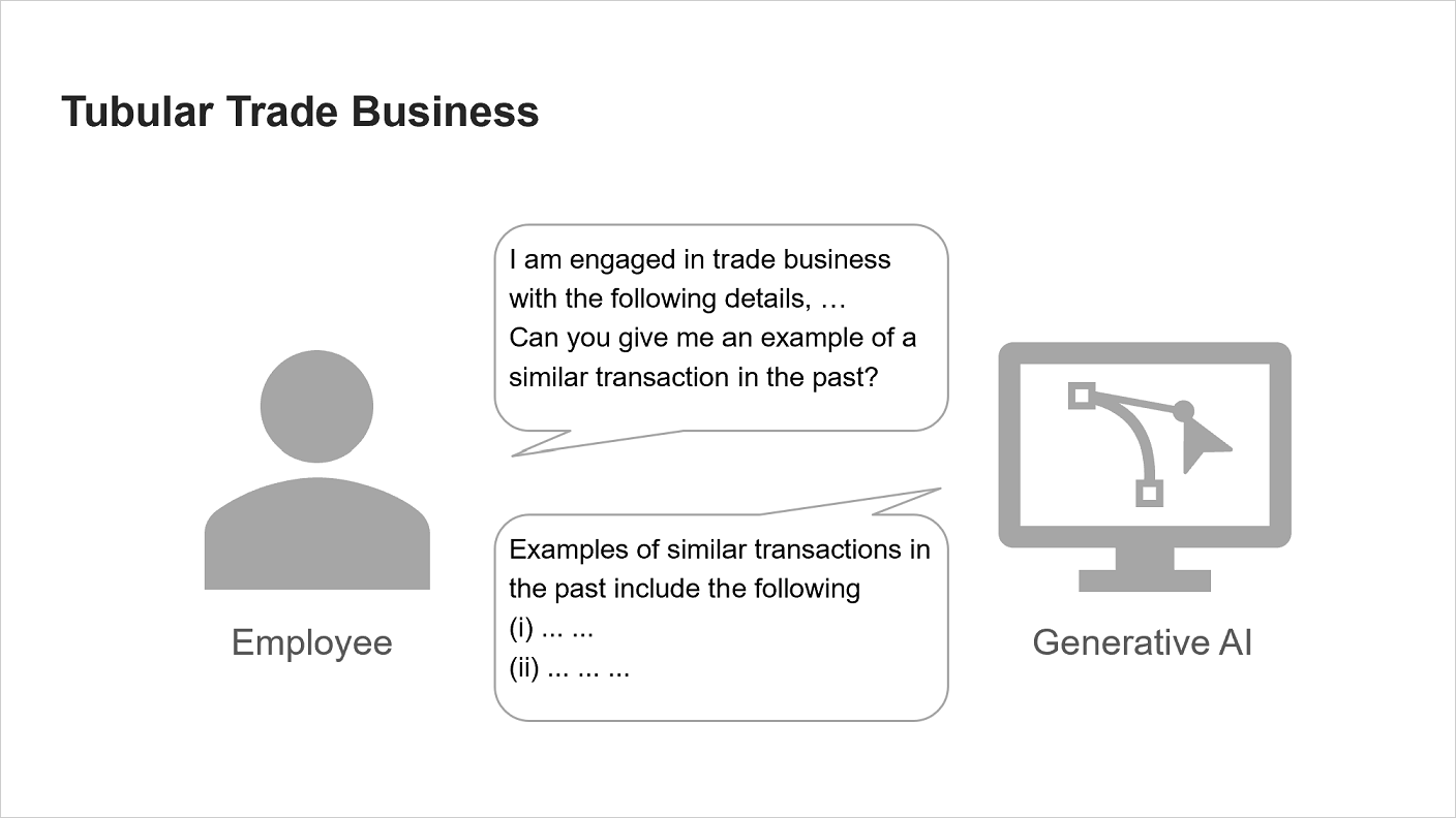 - In the tubular trade business, we have initiated the development of an application to support specific tasks. This trial aims to assess the generative AI can function as a business assistant by incorporating and utilizing datasets comprised of internal rules, relevant regulations, operational knowledge, and past transactional data.