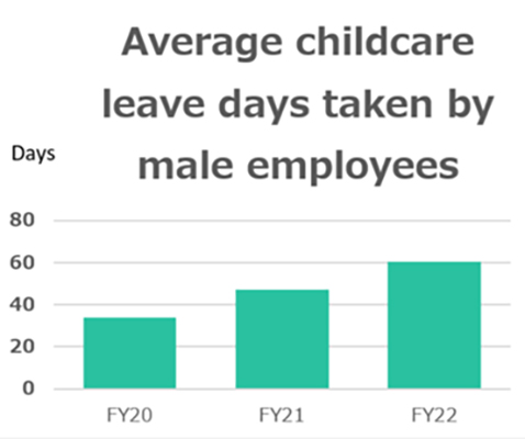 Additionally, Sumitomo Corporation promotes initiatives to help all employees balance their career alongside childcare. This includes systems such as childcare leave and shorter working hours that go beyond legal stipulations, and we have made childcare facilities available for our employees. With regards to childcare leave, we do not pursue a simple increase in the rate of leave takers but aim to foster a workplace culture where individuals, regardless of gender, feel empowered to take childcare leave as needed, for as long as necessary. Through targeted awareness campaigns and individual check-ins with expectant fathers, in FY2022, the rate of male employees taking childcare leave was 67.3%, for an average of 60 days. Further, we have established a special support system for expatriate employees who are accompanied solely by their children, and a total of 18 employees have used this system to date.