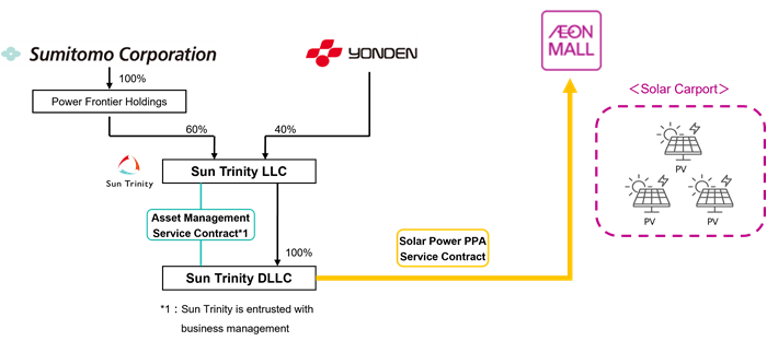 Aeon Mall Co., Ltd. (Head Office: Chiba City, Chiba Prefecture; President and CEO: Yasutsugu Iwamura; hereinafter, “AEON MALL”) and Sun Trinity LLC (Location: Chiyoda-ku, Tokyo; Representatives: Toshiki Kashihara, Takanori Kitayama; hereinafter, "Sun Trinity"), a joint venture between Sumitomo Corporation (Head Office: Chiyoda-ku, Tokyo; Representative Director, President and Chief Executive Officer: Masayuki Hyodo; hereinafter, "Sumitomo Corporation"), and Shikoku Electric Power Company, Incorporated (Head Office: Takamatsu City, Kagawa Prefecture; Director and President: Keisuke Nagai; hereinafter, "Shikoku Electric Power"), has announced that they have concluded a comprehensive agreement for an on-site solar corporate PPA (Note 1) (hereinafter, the "Agreement"), to install carport-type solar power generation equipment (hereinafter, "Solar Carports") with a total capacity of approximately 15,000 kilowatts, which will be the largest in Japan in the outdoor parking lots of Aeon Mall's domestic commercial facilities.