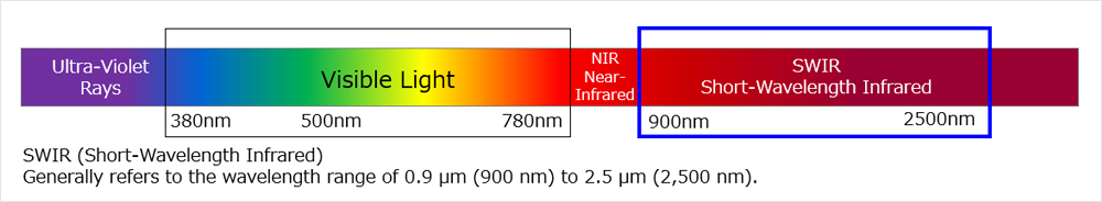- SWIR technology distinguishes between materials based on their absorption and reflection characteristics, even when such differences are invisible in ordinary light. Because water appears black under SWIR and the imaging is unaffected by fog, smoke or dust, stable sensing is possible even in harsh environments. This enables detection of liquids, foreign substances and material differences that conventional cameras struggle to capture.