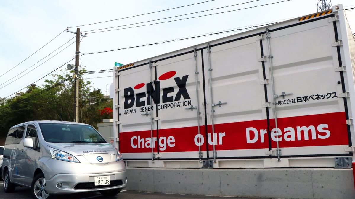 The power storage system newly installed at Japan Benex comprises EVBs from 24 Nissan Leaf vehicles, fitted inside a 20 ft shipping container. The system has a storage capacity of about 400 kWh, enough to power 40 average households for a whole day. The power storage system supplements electricity used at the plant during peak demand, and stores for efficient utilization of the surplus energy generated by the plant’s rooftop solar panels. By installing the power storage system, the company can expect savings on its electricity bills by keeping its contract amperes low. It also enables the company to use renewable energy to a greater extent.