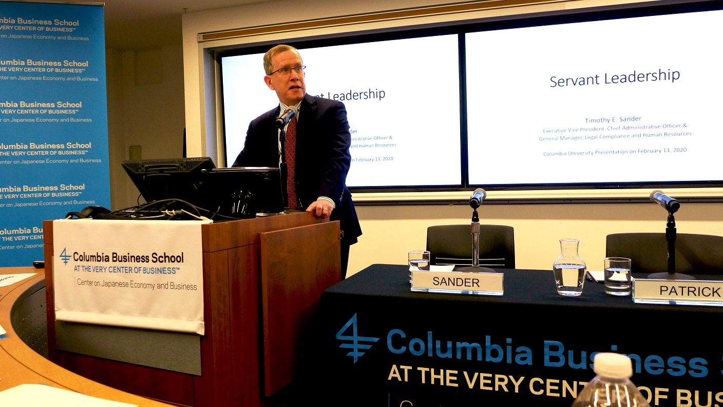 One example was Tim Sander, Executive Vice President and Chief Administrative Officer of Sumitomo Corporation of Americas, who addressed an audience of students and faculty from Columbia Business School early in 2020 under pre-COVID conditions. Professor Hugh Patrick, CJEB Chairman, moderated the event, in which Sander spoke about SCOA’s foundational values and reflected on his 25-year career at the company. Anchored in the philosophy of “servant leadership,” Sander tied this principal to the Sumitomo mindset of service “Jiri Rita Koushi Ichinyo” or “benefit for self and others, public and private interests are one and the same.”