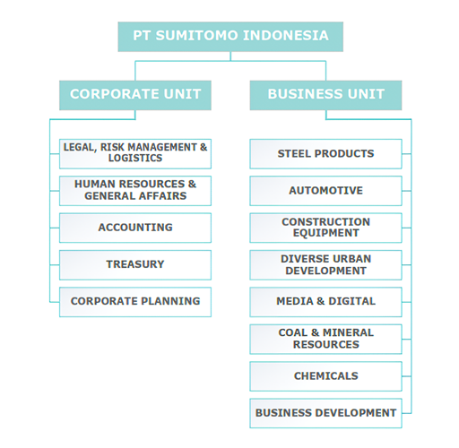Sistem organisasi ini mengarahkan PT Sumitomo Indonesia untuk mengintegrasikan orang-orang dengan kompetensi, latar belakang, dan pengalaman yang berbeda dan berkualitas tinggi untuk mengembangkan hasil yang inovatif baik untuk produk maupun layanan. PT Sumitomo Indonesia menyebut sistem organisasi ini sebagai “Business Unit Management System”. Di samping kesepuluh unit bisnis yang disebutkan di atas, terdapat unit korporat yang berperan untuk mendukung kelancaran operasional unit bisnis.