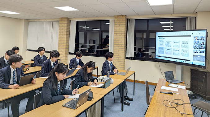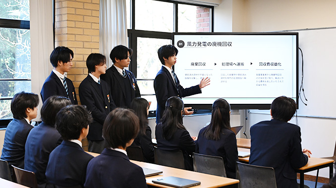 続いて、選抜12名によるプログラム第2回を実施し、3つのグループが前回の宿題として準備した 脱炭素社会実現に向けた事業提案を発表しました。テスト期間と重なり限られた準備時間にもかかわらず、実ビジネスの視点までを踏まえた説得力あるアイデアが披露され、企業側の参加者から驚きの声が上がりました。社会人からの助言を真剣な眼差しで受け止め、自らの将来に主体的に向き合う姿が非常に印象的でした。複数の生徒から「今年一番の授業だった」との声も寄せられ、双方にとって学びの深い場となりました。