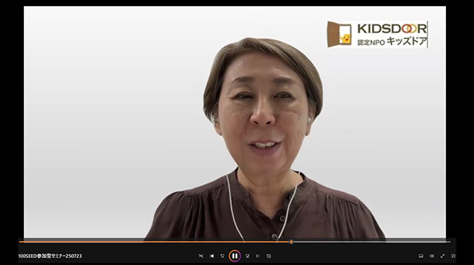 このうち7月に開催されたキッズドア様のセミナーでは、経済的困難を抱える家庭の中高生が直面する教育格差と、その解消に向けた同団体の取り組みが紹介されました。大学生や社会人ボランティアがサポートを行い全国で展開されている無料学習会の様子などが共有され、参加した役職員は真剣に耳を傾けていました。