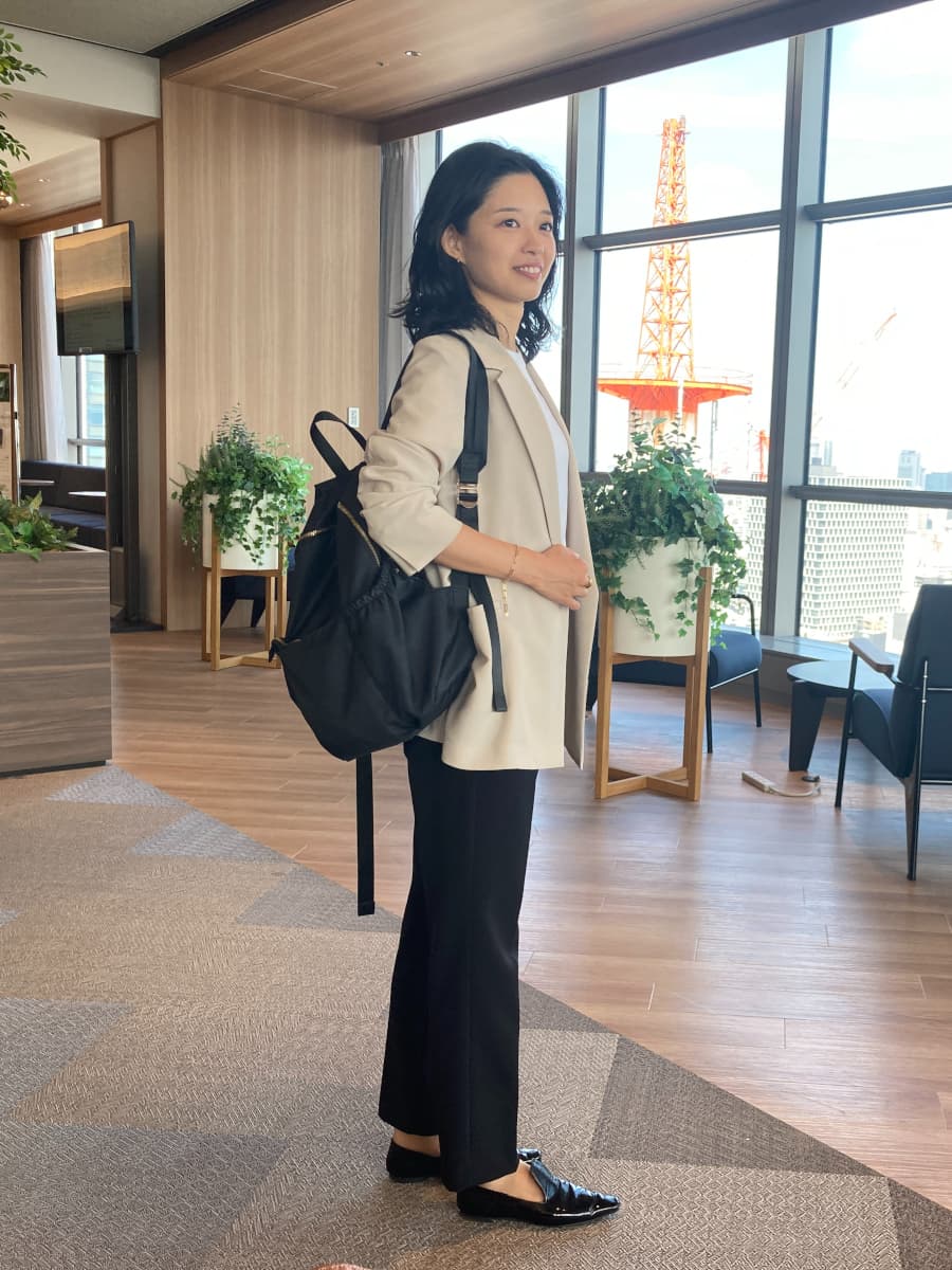 ヘルメットをかぶって工事現場にも入れる「ペタンコ靴、パンツ、きれいめリュック」です。入社1年目からほぼ毎日このスタイルです。