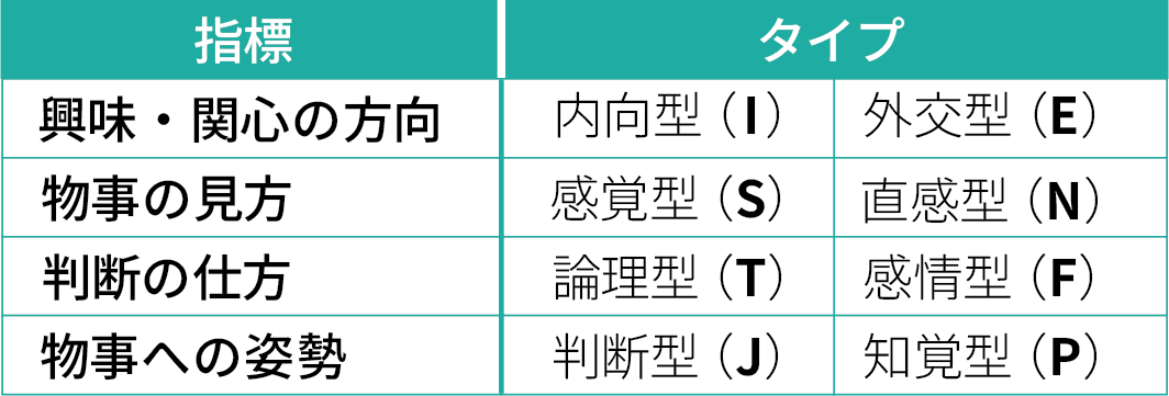 16 Personalitiesは、45以上の言語に対応しているオンライン性格診断で、回答をもとに、以下4つの指標にもとづいて性格傾向を把握。自己理解を深めるきっかけやチームビルディングなどにも活用されています。各指標は2つのタイプに分かれており、それぞれを組み合わせることで、全部で16通りの性格タイプが導き出されます。
