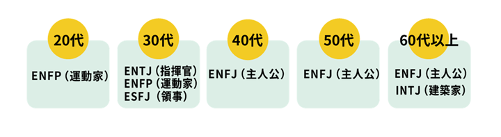 岡 世代別のデータを見ると、1位のENFJは、20〜30代にはあまり見られず、40代以上に多い結果に。上司がこのタイプという確率も高いかもしれないですね。