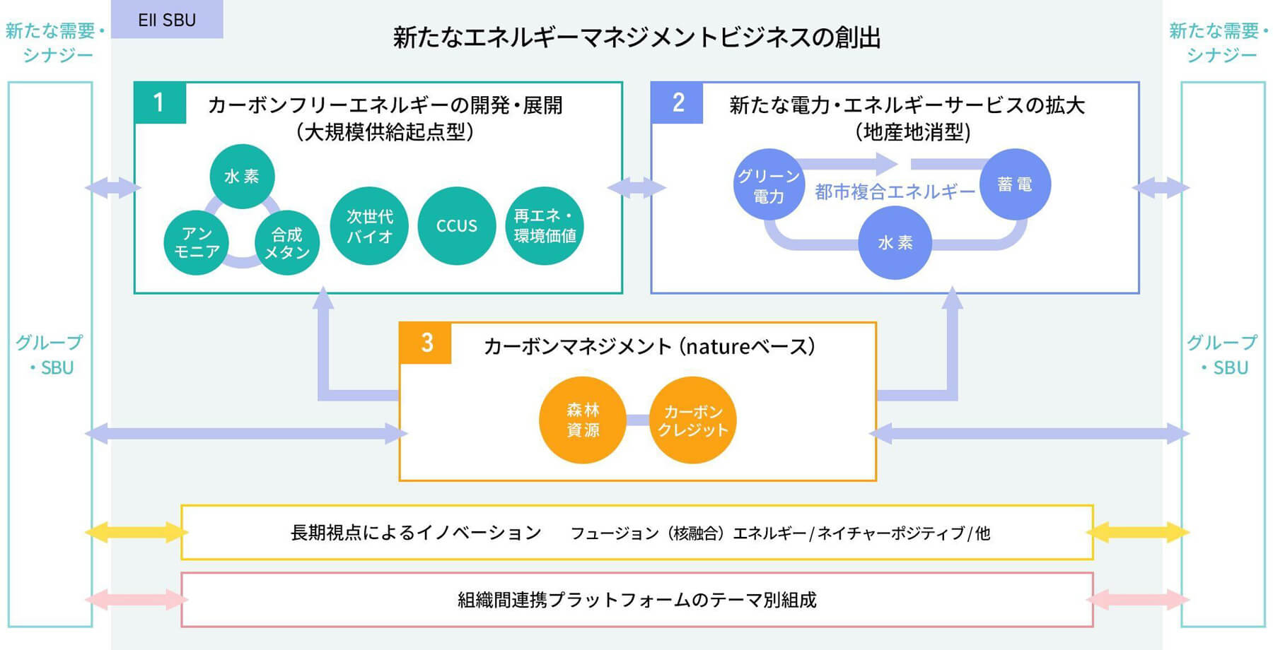 テーマごとに社内外の組織を連携させた「組織間連携プラットフォーム」を組成し、仮説・実証を繰り返し、具体的にカーボンクレジット、CCUS、バイオエネルギーなどのビジネスを追求する営業組織が誕生しています。