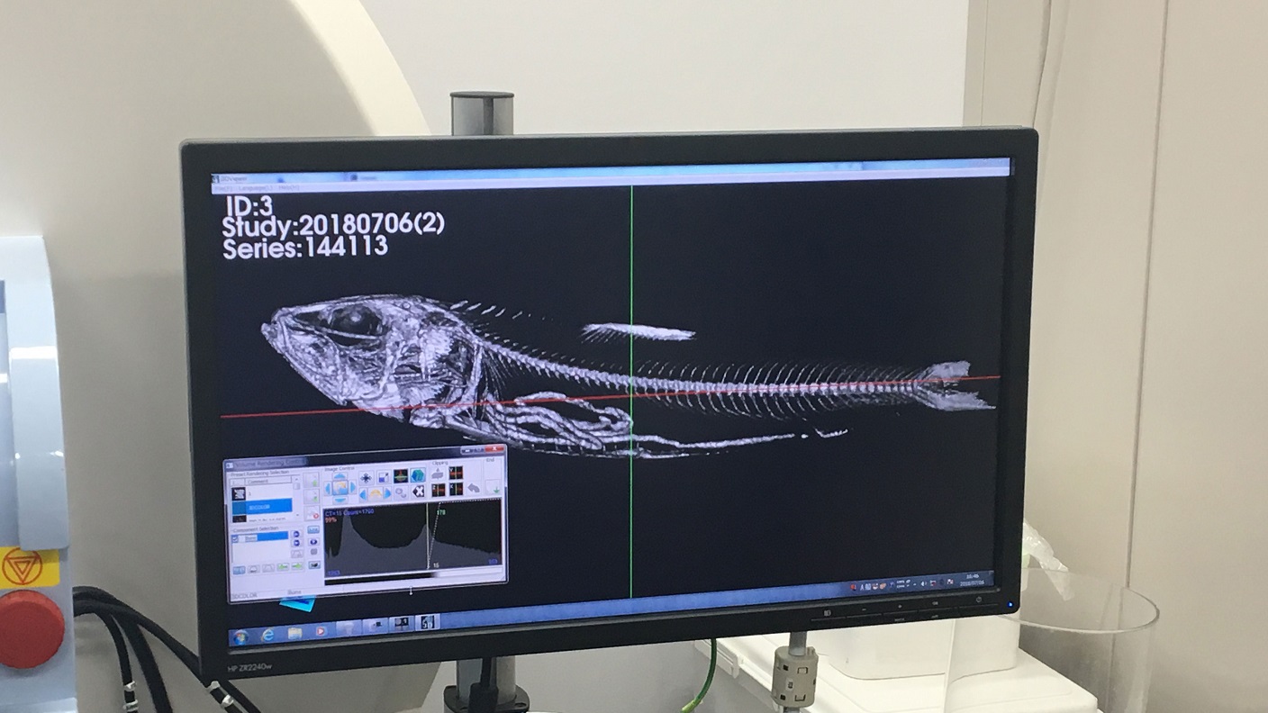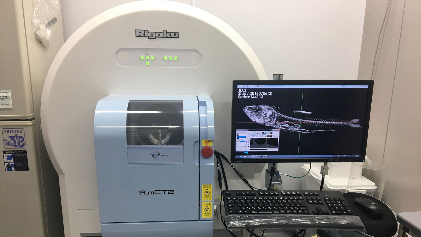 CosmoScanは、マウスやラットといった実験動物の体内を透過したX線の量を測定し、骨や脂肪、臓器の様子をCT画像として表示する機械である。撮影にかかる時間が最速3.9秒と短く、高画質かつ高解像度の画像が撮影できる点が特長であり、骨粗しょう症やメタボリックシンドロームなどの研究で使用されている。今回は動物ではなく冷凍メザシでデモンストレーションを実施した。開始してほどなく、メザシの骨格がモニターにくっきりと映し出され、見学者からは驚きの声が上がった。