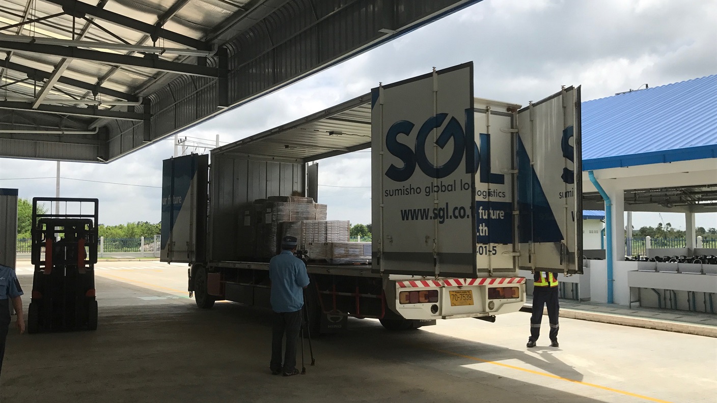 カンボジア政府はQIP企業(投資適格プロジェクト企業)に関税免除等のさまざまな恩典を優先的に与えており、SMCはこの恩恵を受けている。SMC工場で組み立てた製品は、トラックでタイまで輸送し、タイの日系車載・家電メーカーに納品している。物流については、部品をタイからカンボジアに運ぶトラックに、組み立てた製品を搭載しピストン輸送することで、コストダウンを図っている。今回は、当社事業会社であるSGLのトラックからの部品積み下ろし、製品の搭載を見学した。特に製品のトラックへの搭載は気を使う。従業員はフォークリフトを慎重に、かつ器用に操縦し、荷台の中心に製品を載せる。左右どちらかに傾くと、輸送中に荷台の内壁に製品が衝突し、製品が破損する確率が高まるからだ。当然、トラックのドライバーにも安全運転を徹底させる。製品を搭載したトラックが工場をゆっくり後にするのを目にし、タイへの無事の到着を祈った。