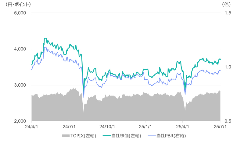- 2024年度期初からの当社株価は、2024年8月と2025年4月に発生した世界的な株式市場下落の影響を受け、一時的に急落する場面もありましたが、概ね横ばい圏内で推移しました。
