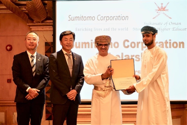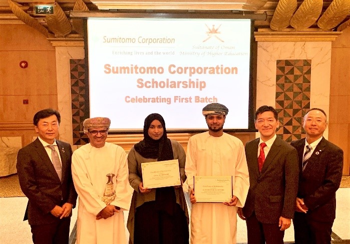 住友商事株式会社(本社:東京都千代田区、代表取締役 社長執行役員 CEO:兵頭誠之、以下「住友商事」)および中東住友商事会社(本社:アラブ首長国連邦ドバイ、社長:成清正浩、以下「中東住商」)は、住友商事マスカット事務所(本社:オマーンマスカット、代表:中村圭、以下「マスカット事務所」を通じて、日本の大学院に留学するオマーン人学生を支援する「住友商事オマーン留学生奨学金」(以下「本奨学金」)プログラムを開始しました。今般、第1期生として選抜された2名の授与式をマスカットで開催し、両名の日本での学生生活がスタートします。