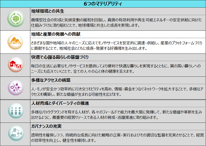 住友商事グループは『社会とともに持続的に成長するための6つのマテリアリティ(重要課題)』を、事業戦略の策定や個々のビジネスの意思決定プロセスにおける重要な要素と位置付け、事業活動を通じて課題を解決することで持続的な成長を図っていきます。本事業は、「地域と産業の発展への貢献」に資する事業です。