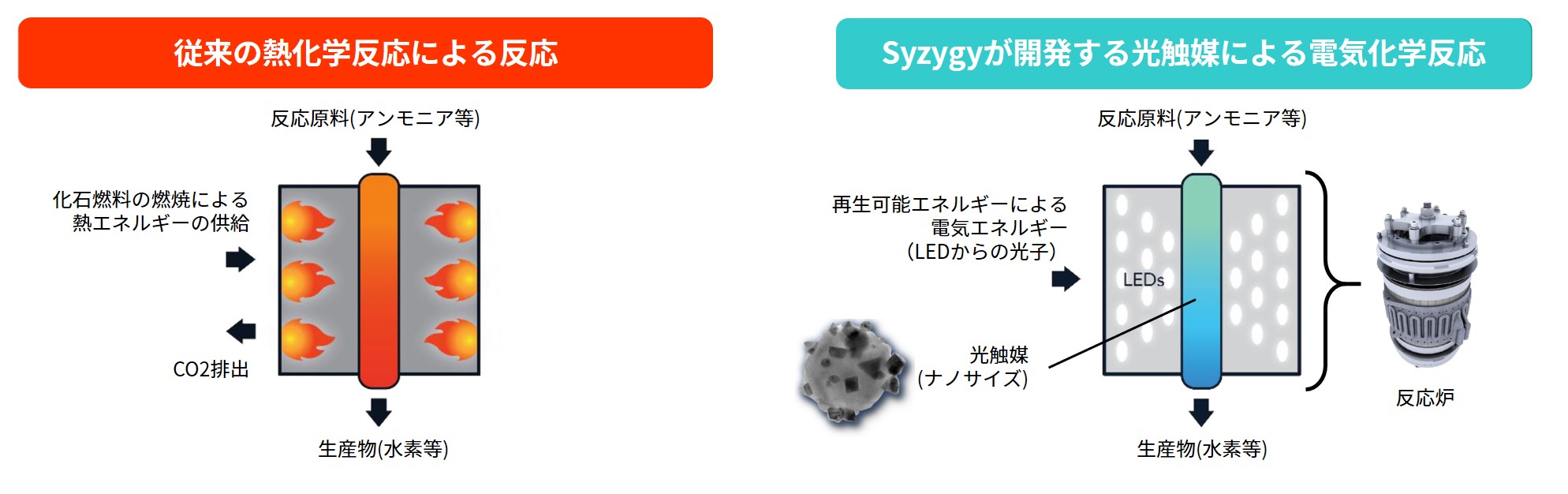 光を照射することにより、さまざまな化学反応を促進したり、化学物質のエネルギーを増加させたりする物質。Syzygyの光触媒を用いることで、従来高温高圧下で引き起こしていたさまざまな化学反応を比較的常温に近い温度で引き起こすことができ、化学反応時のCO2排出量の削減、高効率、低コストなどのメリットが期待できる。水素の製造プロセスでは、水の電気分解、水蒸気や天然ガスの改質、アンモニアの分解などさまざまな化学反応が必要になるため、水素のさらなる普及にあたって光触媒の活用が期待されている。