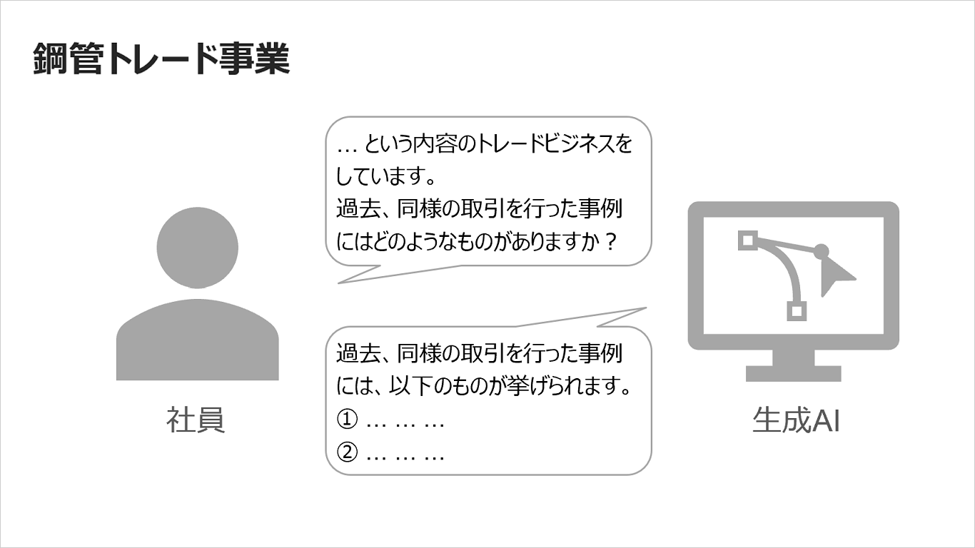 - 鋼管トレード事業では一部業務を支援するアプリケーションの構築を開始。生成AIが社内ルールや関連法令、業務知識や過去の取引情報などを保持し、業務上のアシスタントとして機能するか検証します