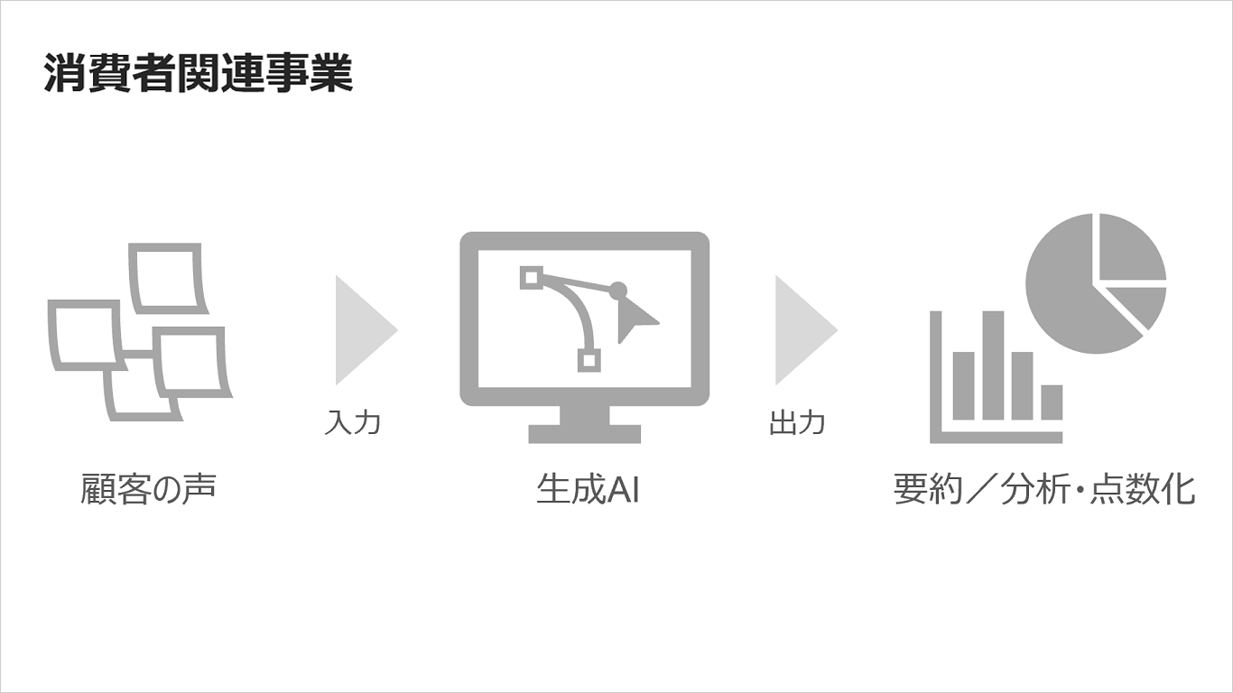- 消費者関連事業では、お客さまサポートセンターに寄せられた顧客の声(Voice of Customer)の要約、分析・点数化を行うレポートツールを構築し、より深いインサイトを捉えることで顧客満足度の改善につなげていきます