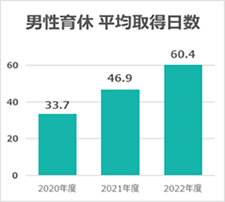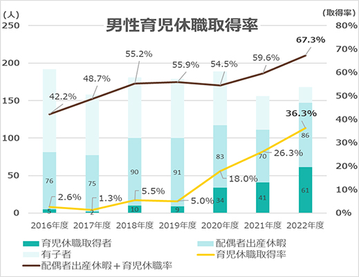 また、キャリアと育児の両立支援についても、全社員を対象に様々な取り組みを進めています。例えば法定を上回る育児休職や短時間勤務などの各種制度の整備、保育施設の確保などを行っています。育児休職については取得率向上のみを目的とせず「性別にかかわらず、育児休職を取りたい人が取りたい時期に、取りたい期間取得できる職場」を目指し、社内での啓発活動や出生時の育休取得意向確認などを行い、2022年度の男性育児休職取得率も67.3%、取得平均日数も60日と増加しています。また、子のみ帯同する海外駐在員への支援制度を整備、累積18人の利用実績があります。