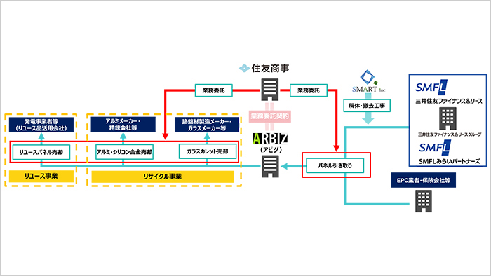 住友商事株式会社(以下「住友商事」)、三井住友ファイナンス&リース株式会社(以下「SMFL」)、SMFLみらいパートナーズ株式会社(以下「SMFLみらいパートナーズ」)、株式会社アビヅ(以下「アビヅ」)、および株式会社SMART(以下「SMART」)(以下総称して「5社」)の5社は、使用済み太陽光パネルのリユース・リサイクル事業の実現に向けた実証実験の覚書を締結しました。