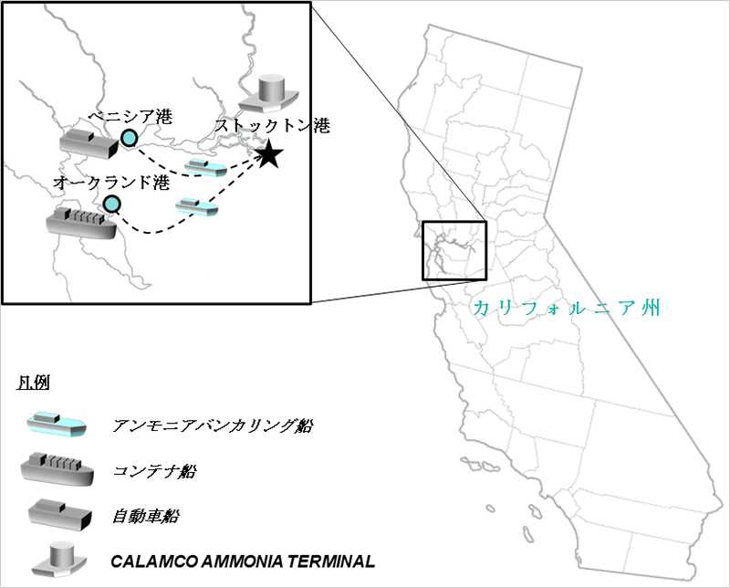 カリフォルニア州最大のアンモニア小売事業者であるCALAMCOは、2027年頃にアンモニアの輸入調達を停止し、環境負荷の低いクリーンアンモニアの地場生産への切り替えを予定しています。本実証では、CALAMCOによる輸入停止を機に、ストックトン港においてCALAMCOが保有・運営するアンモニア基地を利活用し、近隣のベニシア港に寄港する自動車運搬船やオークランド港に寄港するコンテナ船向けに燃料アンモニアの供給を検討します。