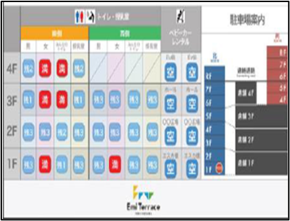 - 駐車場の空き台数表示、ベビーカート貸し出し情報表示など、館内の状況をサイネージやスマホで可視化