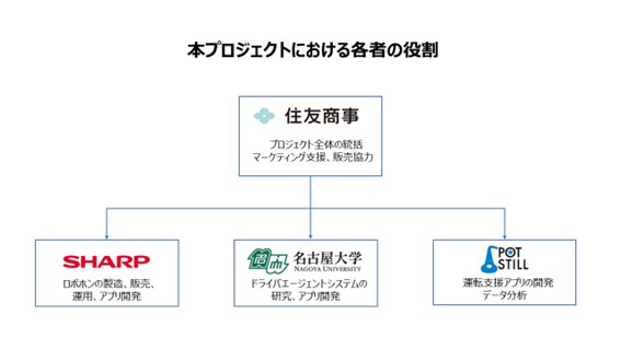 住友商事株式会社(以下、「住友商事」)、名古屋大学未来社会創造機構、株式会社ポットスチル、シャープ株式会社(以下、「シャープ」)の4者は、NPO法人高齢者安全運転支援研究会と大阪府の八尾自動車教習所の協力のもと、シャープのモバイル型ロボット「RoBoHoN(ロボホン)」(以下、「ロボホン」)を活用したドライバエージェントシステム(注1)による高齢ドライバ向け運転支援ソリューションの実証を2025年1月23日、28日に大阪府の一部の公道で先行実施します。また、同年4月からは全国の公道でも実証を行います。それらの実証を経て2025年度中のプレサービス提供開始、2026年度中の商用化を目指します。