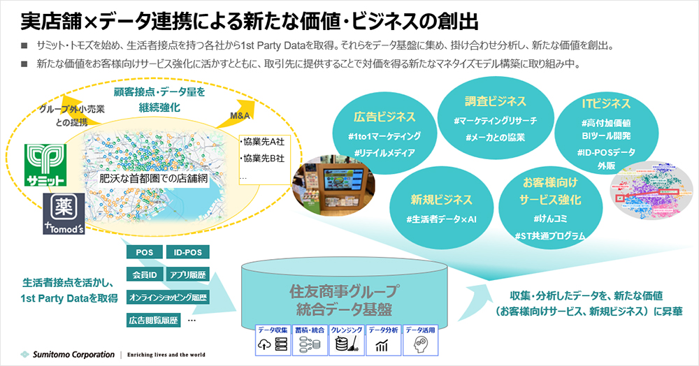 住友商事グループではサミット124店舗、トモズ265店舗を展開しており、年間延べ2億回以上の生活者との接点があります。購買頻度の高い、スーパーマーケットとドラッグストアの「食」と「健康」のデータから得られる首都圏の会員500万人の生活に根差した購買データに加え、お客様との深い関係性を通じて得られる定性データも活用し、メーカー・小売企業向けの新たなマーケティング事業に挑戦していきます。