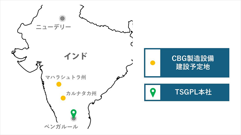 TSGPLへの出資後、まずはサトウキビの主要生産地である、インド南部カルナタカ州とマハラシュトラ州で4基のCBG製造設備の建設を開始するともに、製造拠点拡張の戦略策定や実現可能性の調査を行います。加えて、住友商事およびTruAlt社の知見や経験を生かし、バイオエタノール製造設備の拡大や、バイオエタノールを用いた持続可能な航空燃料(以下SAF)の製造も将来的に検討していきます。
