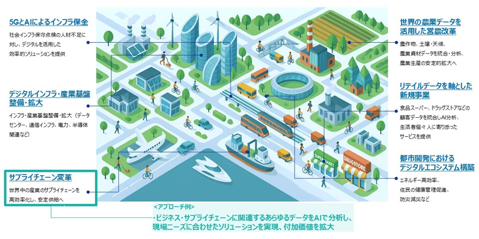 住友商事は、事業競争力の強化とグローバルなDX推進を、グループ全体で加速してまいります。完全子会社化を発表したSCSKと一体となり、事業知と技術力を融合させることで、サプライチェーンの新たな価値創出とグローバルな業務変革を実現していきます。
