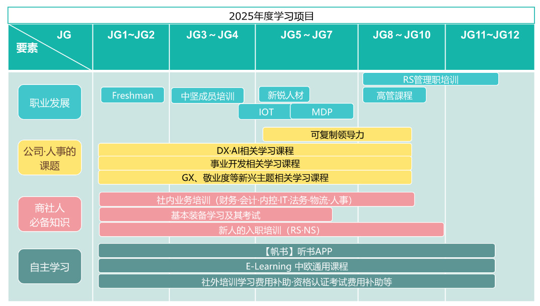 中国住友商事Group2025年度的培训体系以培训“要素”为核心,面向所有职级设计学习内容。旨在通过培训活动、E-Learning课程、APP程序等多样化手段,将知识技能赋能给需要的同事,助力其实现工作目标,挑战新的高度。实现公司与员工的【共同成长】。